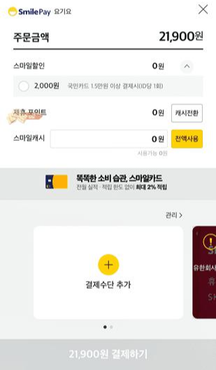 주문하기 창에서 주문내역 확인하고 결제수단 선택에서 [스마일페이]를 선택합니다. 그리고 할인쿠폰 등을 적용하고 맨 아래에 결제하기를 누릅니다.