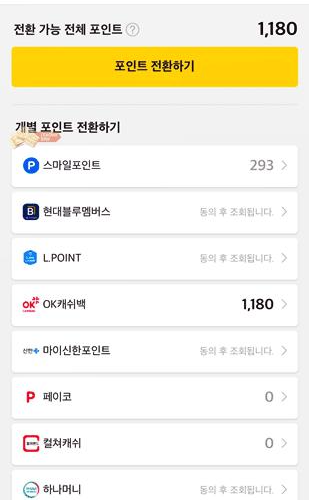 앱 연동창에서 제휴포인트 항목의 캐시전환을 선택합니다.