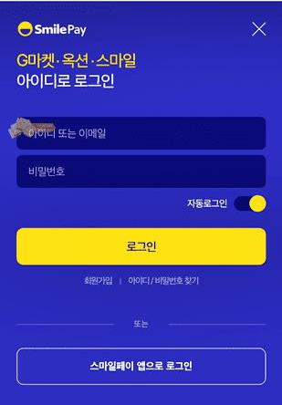 g마켓,옥션,스마일 아이디로 로그인 하라는 페이지가 나옵니다. 스마일페이 앱으로 로그인을 선택하면 더욱 편리합니다. 앱이 없어도 자동으로 설치됩니다.