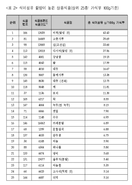 이 중 식이섬유가 가장 많이 들어있는 식품은 무엇일까요? 보건복지부가 밝힌 식이섬유 함량이 높은 상용 식품 상위 25종은 아래와 같습니다.