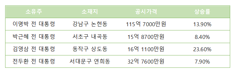 위와 동일한 데이터 시스템에 따르면 전직 대통령 소유의 주택들 공시가격도 오르고 있습니다.