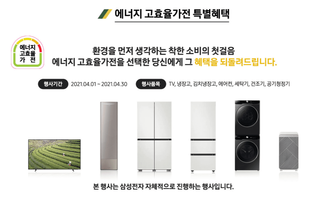 삼성전자는 에너지소비효율 우수한 26종의 가전에 대해 최대 30만원 할인 혜택을 주고 있습니다. 삼성전자 에너지고효율 특별혜택 가전 26종 확인은 관련 페이지를 참고해주세요. (※ 삼성전자 국민가전 페스타 '에너지고효율 특별혜택'은 자체적으로 진행하는 행사입니다.)