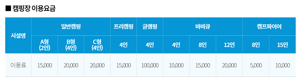 가격도 달라졌습니다. 글램핑을 제외하고는 모든 캠핑 물품의 대여가 없어졌기 때문입니다. 개인 및 공중 보건위생을 위해 각 구역에 따른 시설 이용료만 내고 텐트, 그늘막 등 대여용품은 각자 준비해 와야합니다.