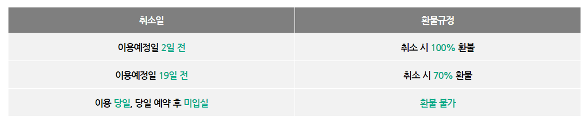 당일예약은 당일 오후 2시까지 가능합니다. 환불의 경우, 이용예정일 2일전에는 전액환불, 1일전은 70%환불, 당일취소 및 당일예약 후 노쇼는 환불이 불가능합니다.