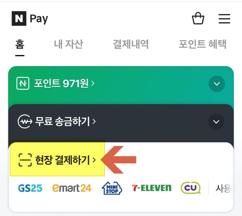 네이버페이의 경우 네이버 앱 상단에 N 페이 아이콘을 선택해 N페이화면으로 들어가 [현장결제하기]를 누르고 상단 탭의 [제로페이]를 선택해 연결할 계좌를 등록해 놓으면 됩니다.