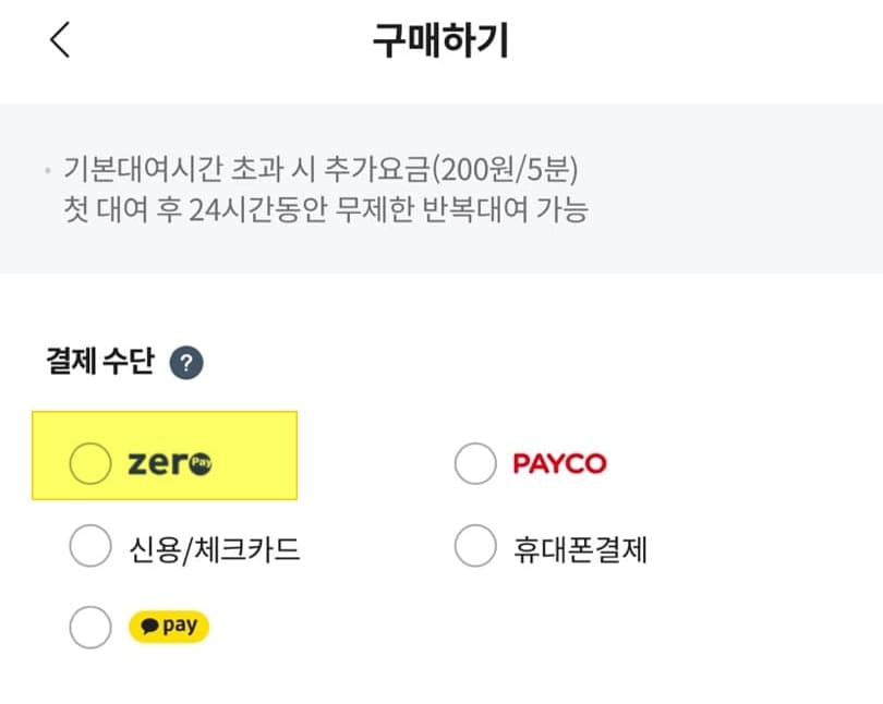 - 따릉이앱에서 이용권 결제방법 중 제로페이를 선택합니다.