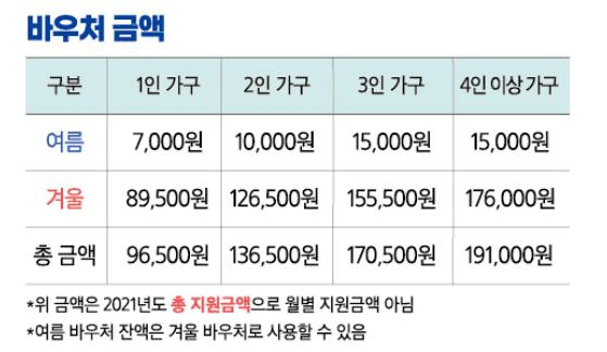 에너지바우처란 에너지 취약계층에게 전기,도시가스,지역난방 등의 에너지 구입을 지원하는 제도입니다. 크게 여름 바우처와 겨울 바우처로 나뉘며 대상자라면 가구원수에 따라 지원금액이 다릅니다.