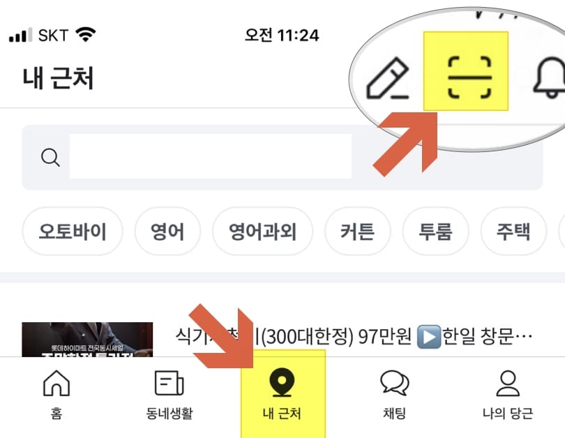 핸드폰에서 당근마켓 앱을 열어 하단메뉴 중 [내 근처]를 선택하면 화면 상단에 QR코드 촬영버튼이 있습니다.