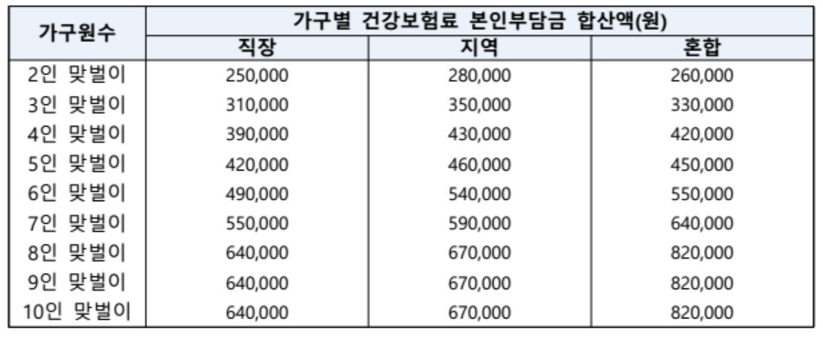 참고로 맞벌이 가구 기준은 부부가 모두 일을 하는 가구 뿐 아니라, 가구 구성원 중 2인 이상이 근로활동을 하는 경우 모두 맞벌이 가구로 계산됩니다. 예를 들어, 부부 중 한명과 자녀 한명이 근로활동을 한다면 맞벌이 가구가 됩니다. 이때 부모는 직장가입자, 자녀는 프리랜서로 지역가입자일 경우 혼합기준으로 확인하시면 됩니다.
