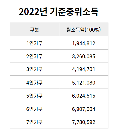 이 요건 또한 '신청 당시'기준입니다. 그러니까 '22년 중위소득 100% 이하여야 합니다. 재산 기준은 가구의 재산이 대도시 3.5억 원, 중소도시 2억 원, 농어촌 1.7억 원 이하입니다.