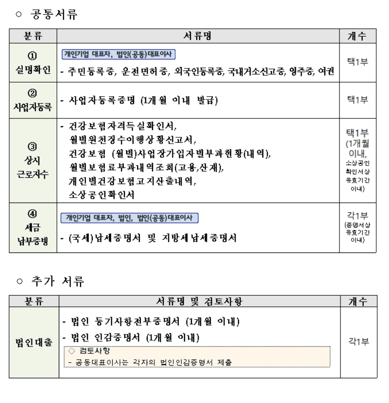 이때, 개인사업자 1인이 사업자등록 번호가 다른 다수의 개인기업을 가지고 있는 경우, 1개 대표기업만 신청이 가능합니다. 또한 2인 이상의 공동대표자가 있는 경우 각각 대출은 불가능하며 대표자 1인을 정하여 신청해야 합니다. 법인사업자는 공동대표이사 모두의 연서를 통해 대출을 신청할 수 있습니다.