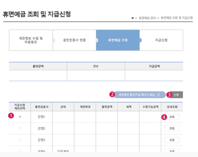 2. '찾아보기'를 선택하여 조회를 진행합니다. 조회된 목록 중에 지급받을 계좌를 선택한 후 '지급 신청'을 선택합니다.