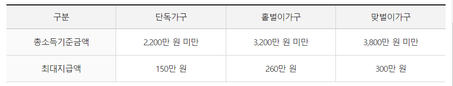 위의 연소득 기준에 부합한다면 단독가구의 경우 최고 150만원, 홑벌이 가구는 260만원, 맞벌이 가구는 300만원까지 지급받을 수 있습니다.