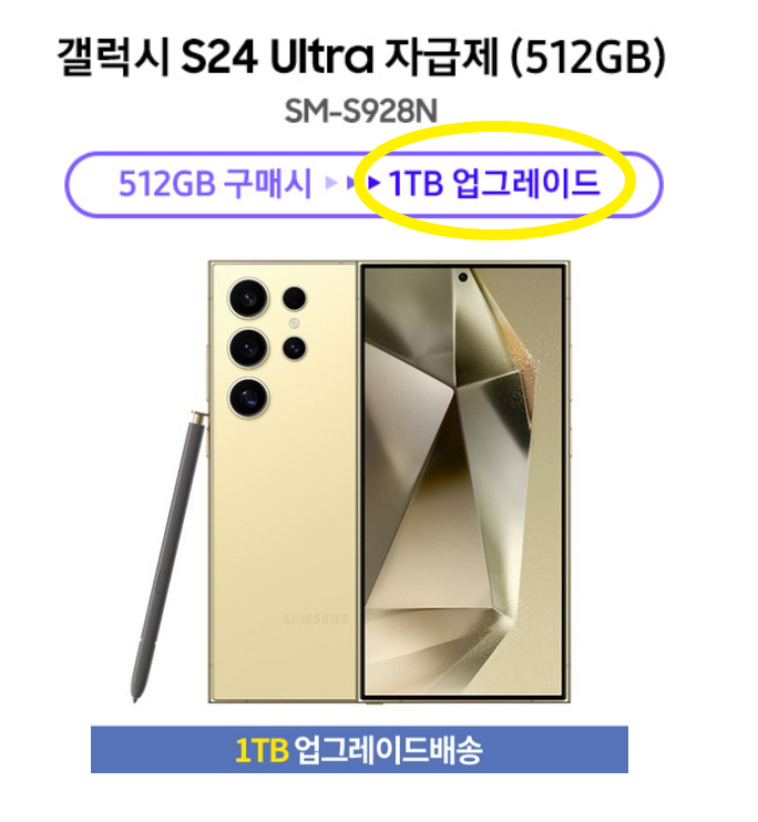 원하는 용량이 1tb였다면 512gb 가격에 구매할 수 있는 파격적인 할인혜택입니다. 용량 업그레이드는 보통 컴퓨터나 노트북 구매시 볼 수 있는 이벤트였는데 핸드폰에서도 나오네요. 참고로 s24 울트라 1tb 출고가는 212만 7400원이니 기본 할인가만 약 40만원 할인을 받는 셈입니다.