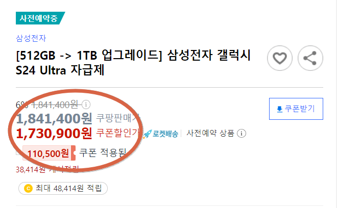 쿠팡 사전예약 페이지에서 원하는 상품을 클릭하면 기본 6%할인 가격이 자동 적용되어 보여집니다. 예를 들어, s24 울트라 512모델이라면 출고가 1,841,400원에서 110,500원 쿠폰이 적용되어 1,730,900원이 됩니다.
