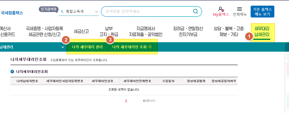 - 먼저 국세청 홈택스에 로그인한 후 '세무대리 납세관리 - 나의 세무대리 관리 - 나의 세무대리인 조회'를 클릭합니다.