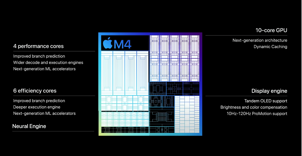 이번에 적용된 M4칩은 M2보다 CPU 가속 성능이 2배 향상되었고 그래픽성능은 4배 향상되었습니다. 어플들을 터치하거나 사진이나 영상 작업시 불러오고 편집하고 여러가지 복잡한 기능을 추가했을 때 걸리는 시간이 로딩없이 빠르게 진행된다는 겁니다. 특히 3D모델링이나 랜더링 등 고성능 그래픽 작업이 필요한 분들은 M4칩의 AI가속성능으로 확 빨라진 처리속도가 더욱 체감될 겁니다.