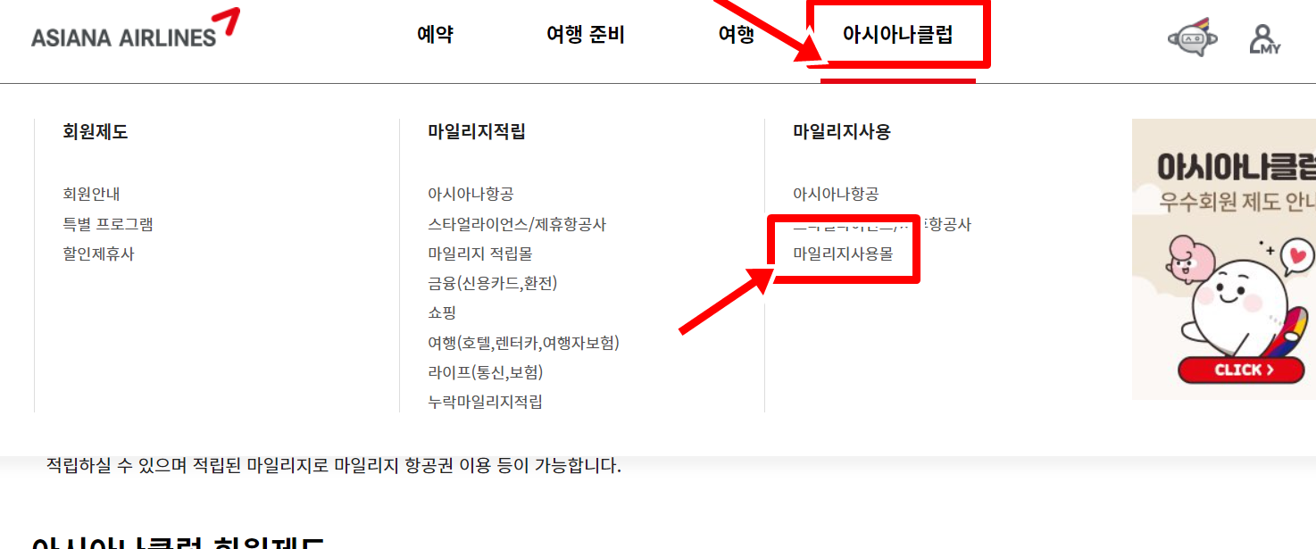 홈페이지 상단 메뉴 중 [아시아나 클럽]-[마일리지 사용몰]을 선택합니다. 상단 메뉴의 [쇼핑]탭으로 들어갑니다.