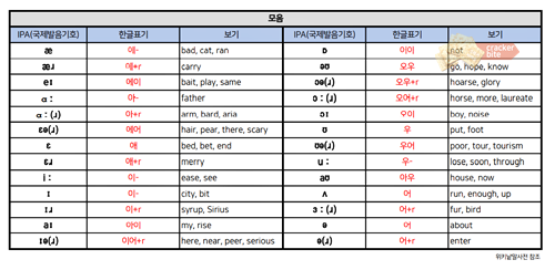 그렇다고 이걸 다 외운다고 영어가 느는것이 아닙니다. 4살짜리 아이가 한글배울때 '문래'의 발음이 왜 '물래'인지 안 배우잖아요. 기본적인 파닉스 발음 법칙만 알아도 충분합니다.