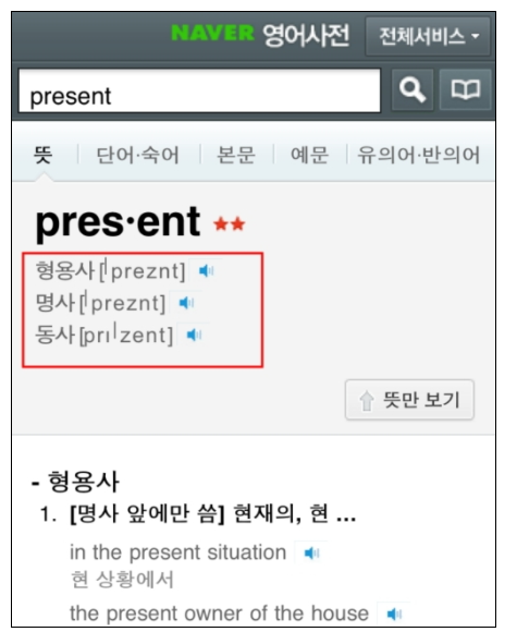 강세 앞에는 어떤 발음인지 강세 뒤에는 어떤 발음인지 파악이 가능해집니다. 발음도 강세부분을 더 길게 해주기 때문에 좀더 정확한 억양 연습에도 도움이 됩니다. 예를 들면 'present' 라는 단어를 사전으로 찾아보면 아래와 같이 나옵니다.
