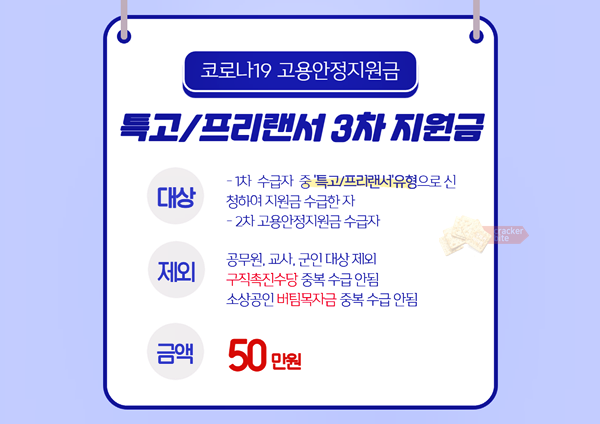 고용노동부에 따르면 지난 1차 긴급 지원금을 '특고 프리랜서' 유형으로 지원받은 자 혹은 2차 고용안정지원금을 신규로 신청해 받은 사람입니다. 엄밀히 말하면 1차,2차 수혜자의 추가 지원이라고 할 수 있습니다. 지원금액은 50만원입니다.