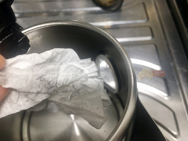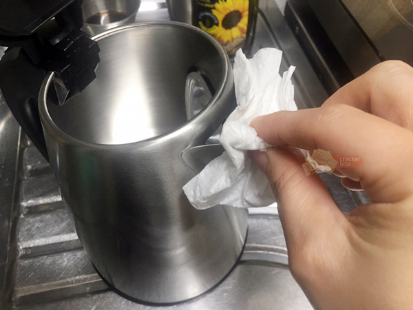 마른 수건으로 물기를 잘 닦고 말려주어 세척을 마무리합니다. 참고로, 모든 과정의 세척은 찬물이 아닌 따뜻하거나 미지근한 물로 해주세요. 끓인 물을 사용하는 과정에 찬물이 들어가면 스테인레스가 변형될 수 있습니다.