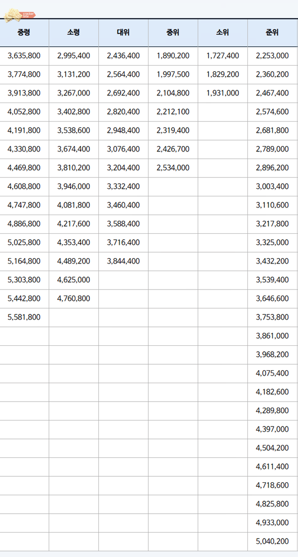 중령부터 소령, 대위, 중위, 소위, 준위 계급의 2021년 봉급표는 아래와 같습니다.