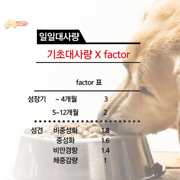 기초대사량과 반려동물에 맞는 수치를 곱합니다. 4개월 미만(적당한 운동량)일 경우 3, 5-12개월(가벼운 운동량)은 2, 비중성화시 (운동량 없음) 1.8 중성화시 1.6 비만 경향은1.4 제중감량필요비만은 1을 곱합니다. 단, 견종의 성향에 따라 다를 수 있는데 에너지 대사량이 아주 심하면 4-8을 곱합니다.