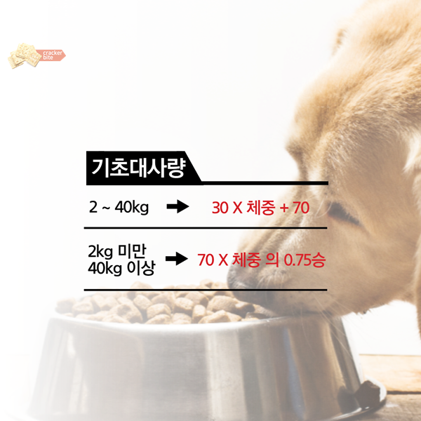 몸무게가 2-40kg인 경우 하루 기초대사량은 '30x체중+70' 입니다. 몸무게가 2kg미만인 경우나 40kg 이상인 경우에는 '70x체중의 0.75승'입니다.