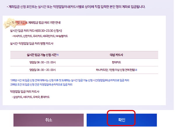 계좌입금 신청 포인트는 실시간 입금되거나 익영업일이내에 직접 입력한 본인 명의 계좌로 입금된다고 안내되어 있습니다. 시간 확인하시고 확인을 눌러주세요.