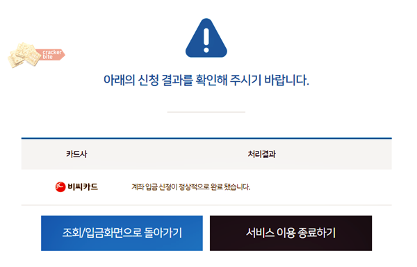 완료되었습니다. 계좌입금 신청이 정상적으로 완료되었다는 메시지와 함께 이제 입금 문자만 기다리면 됩니다.