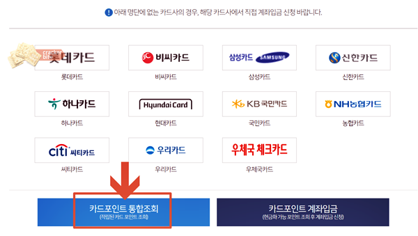 아래 명단에 있는 카드사들의 포인트들을 조회하게 되는데요. 통합조회가 계좌입금이 있는데 일단 어느 카드사에 얼마나 되는 포인트가 있는지 통합조회부터 해보기로 합니다. [카드포인트 통합조회]를 선택해주세요.