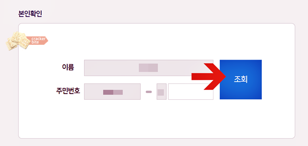 이름과 주민번호 앞자리가 자동으로 나와있고 뒷자리를 이어서 적어주세요. 그리고 조회를 누릅니다.
