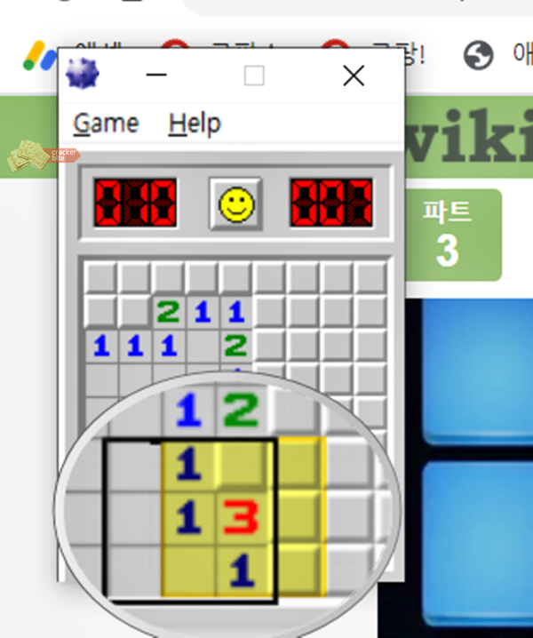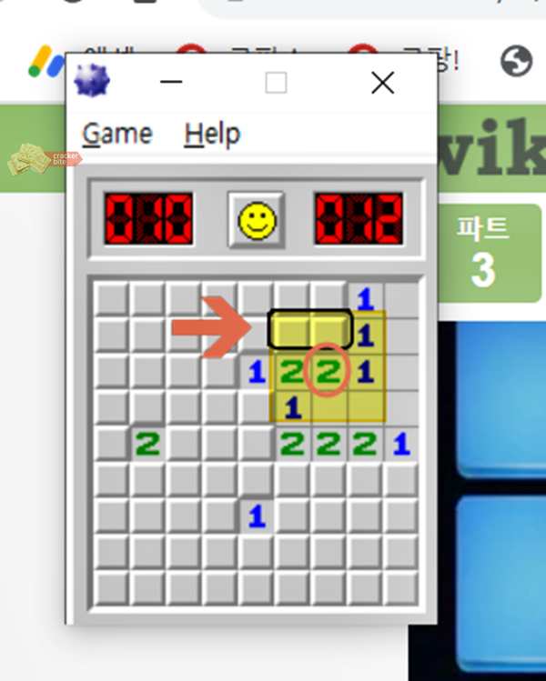 클릭한 곳에 숫자가 나타나는데 이 숫자가 힌트입니다. 그 숫자 칸을 중심으로 3x3영역에 몇 개의 지뢰가 있는지 알려주는 것입니다. 위의 사진에서 동그라미 2 는 주변 노랑 영역에 2개의 지뢰가 있다는 것입니다. 그런데 보니 아직 안 열린 칸이 2개이니 이 두칸은 절대 지뢰라는 것을 알 수 있습니다.