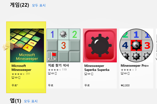검색결과에 여러 지뢰찾기 게임이 나오는데 무료이면서 마이크로소프트에서 지원하는 지뢰찾기는 첫번째 제품입니다.
