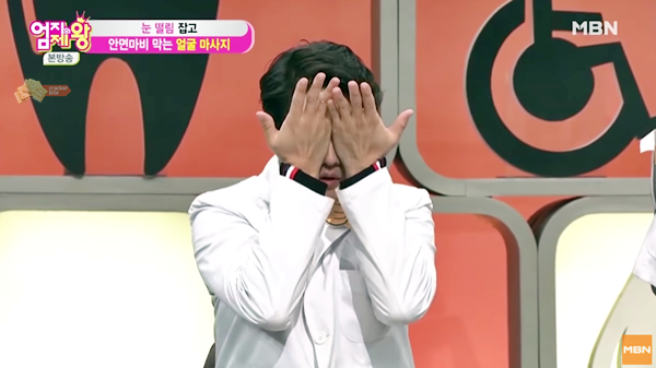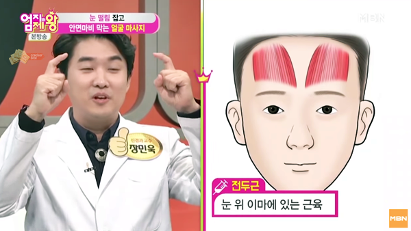 또한 검지 손가락으로 눈 위 이마에 있는 근육 (전두근)을 눈을 크게 뜨면서 들어올려줍니다. 이때 로션을 바르고 마사지를 해주면 자극을 완화할 수 있습니다.