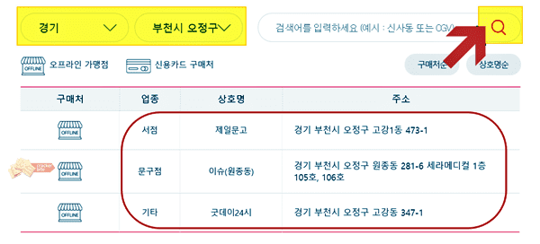 만약 확실한 판매처와 주소를 알고 싶다면 '문화상품권 오프라인 판매처' 찾기에서 시/구 등을 설정해 검색해보세요.